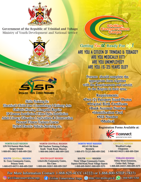 The Civilian Conservation Corps Programme has eight (8) Regional Offices located in Barataria, Mausica, Sangre Grande, Chaguanas, Rio Claro, Princes Town, Siparia, and Tobago. You can get more information by clicking here.